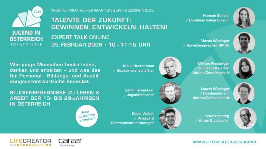 Wie junge Menschen heute leben, denken und arbeiten – und was das für Bildung und HR bedeutet. Einblicke, die Zukunft gestalten Die Jugendstudie 2026 ist die umfangreichste österreichische Datengrundlage über 14- bis 29-Jährige, speziell entwickelt für Personal-, Bildungs- und Ausbildungsverantwortliche.