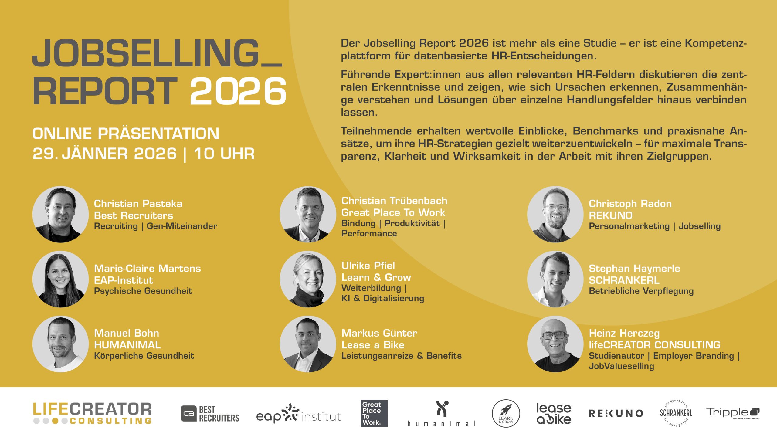Mit dem Jobselling Report 2026 verstärken führende Expert:innen aus allen relevanten HR-Feldern ihre Expertise auf Basis einer gemeinsamen Datenbasis. So werden Ursachen sichtbar, Zusammenhänge verstehbar – und Lösungen über einzelne Handlungsfelder hinaus noch wirksamer.